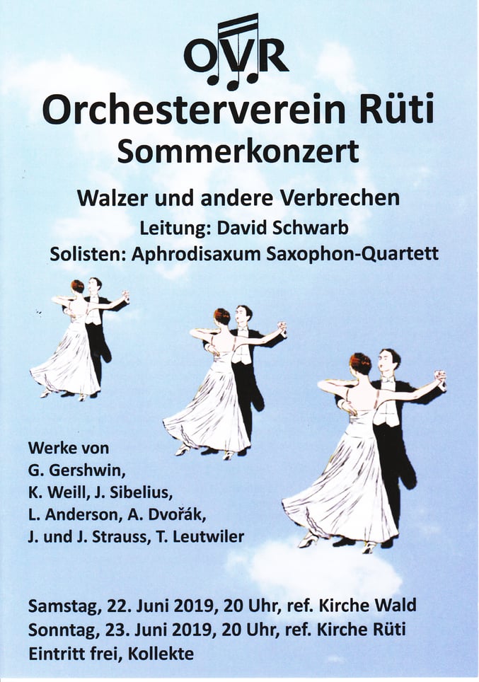 Konzert in Wald und in Rüti des Orchestervereins Rüti unter der Leitung von David Schwarb u.a. mit "Berceuse" opus 21, 1946, und "Les Joyeux Violons" opus 24, 1947, von Toni Leutwiler. David Schwarb hat die zwei Werke auf dem PC erfasst und pdf-Dateien geliefert.